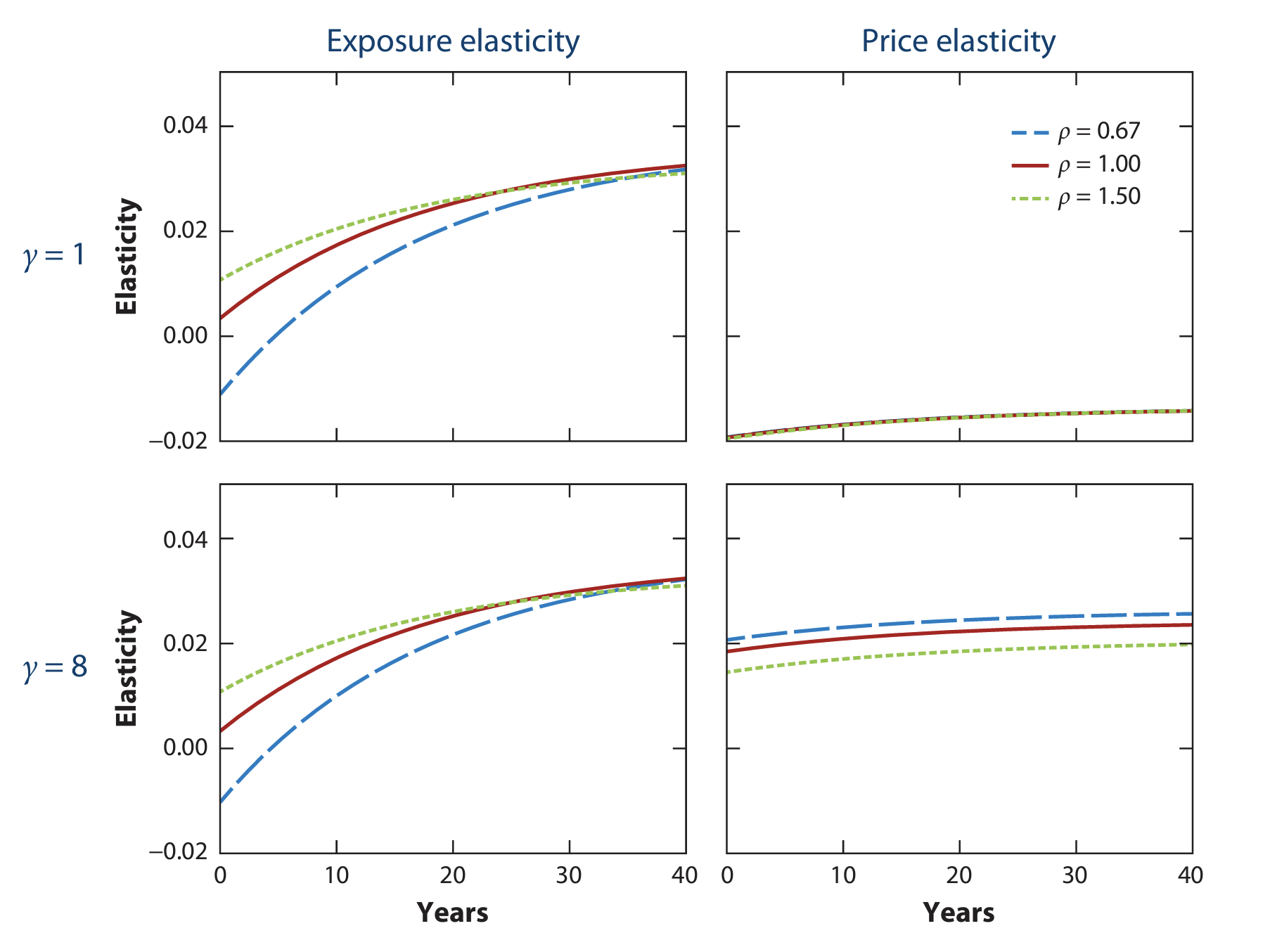 for \(\tau \ge 0\). This specification captures a form of intertemporal complementarity and intertemporal substitution in preferences. In static demand theory, \(\tau = 0\) implies perfect substitutes, and when \(\tau > 1\), the preferences display a form of complementarity as reflected in the cross price effects on demand. In the limiting case when \(\tau\) approaches \(+\infty\), preferences treat the two inputs as perfect complements and consumed in fixed proportions. There is a different notion of intertemporal complementarity as originally defined by [Ryder and Heal, 1973]. Under this notion, increasing \(H_t\), keeping \(I_{h,t}\) fixed should decrease \(C_t\). (They impose other restrictions.) This form of intertermporal complementarity can instead be captured by letting \(\lambda < 0\). Effectively, \(H_t\) is a “bad’’ not a “good,’’ in the CES aggregator. Setting \(0 < \lambda \le 1\) captures a form of consumption durability.