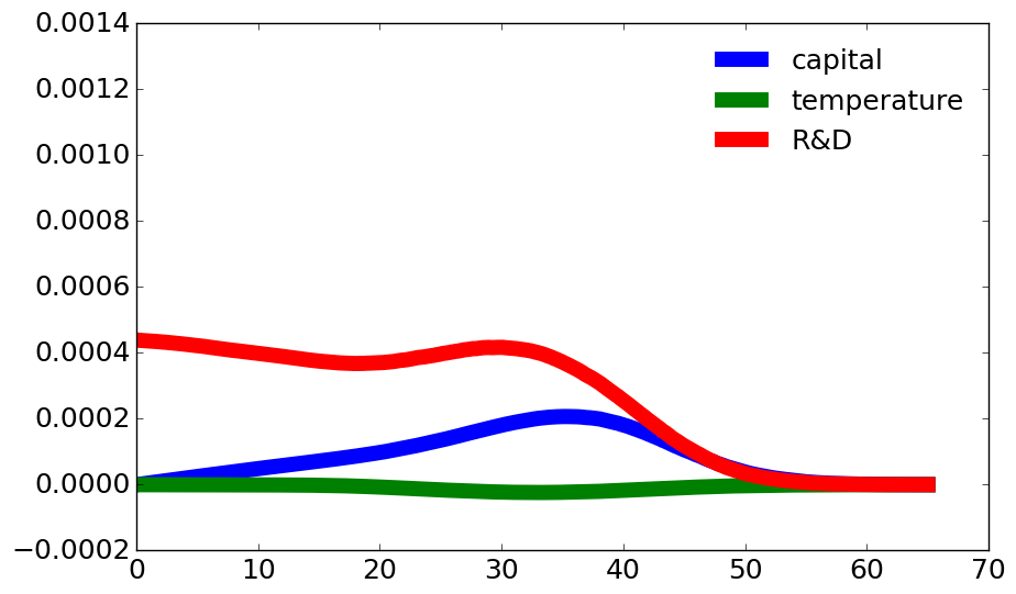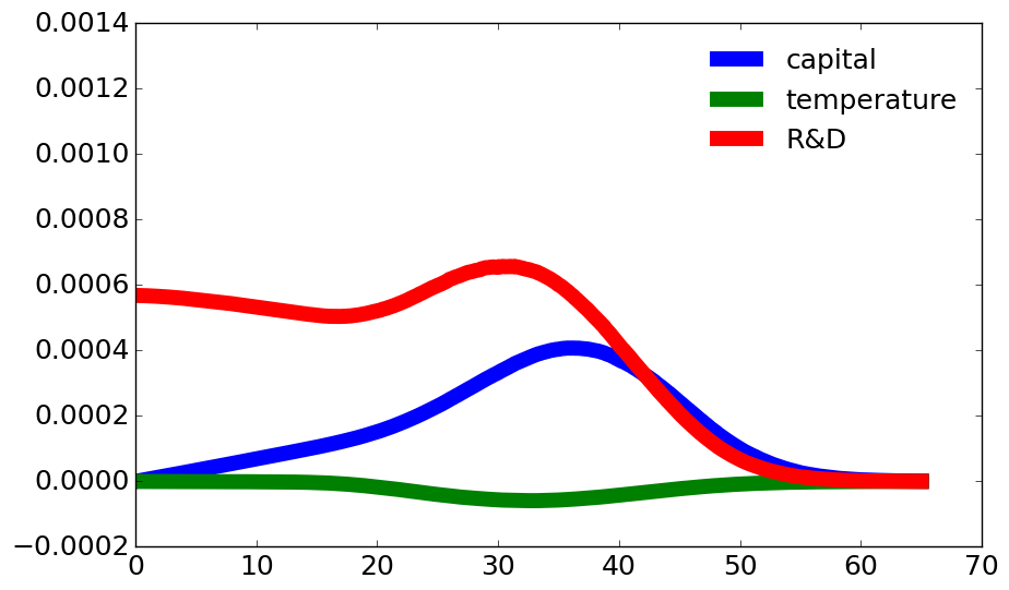 Fig. 11.2, Fig. 11.3, and Fig. 11.4 give plots based on both Decomposition I and Decomposition II for three different values of \(\xi_m.\) As expected, the expected discounted responses become larger for smaller values of \(\xi_m.\) This due, in part, to the fact that the expectations are computed under the uncertainty-adjusted probability measures. The peak impacts are linked to probabilities that a jump will be realized at the respective horizons. While the R&D knowledge stock prospective responses have the biggest impact on the social value of research and development (SVRD), the capital stock responses are also important. Thus state interactions are a notable aspect of the computations. In contrast, the prospective temperature contributions are very modest and negative. Table 11.2 gives the totals for the SVRD contributions along with the associated investments in the initial time period.