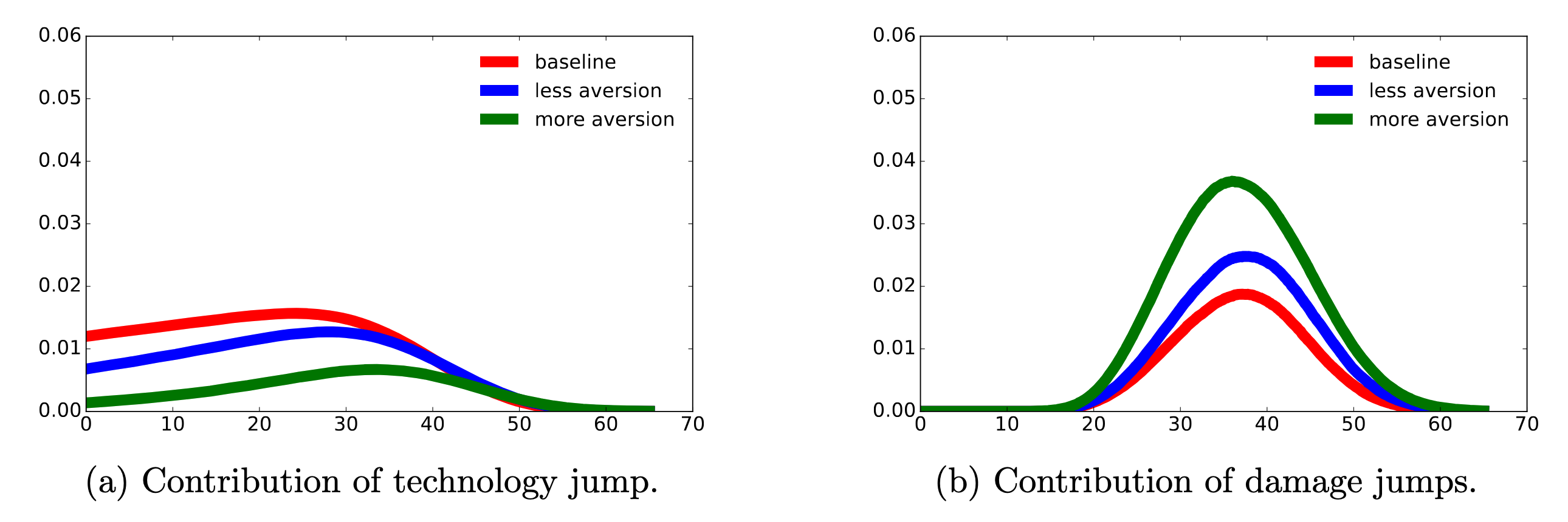 Fig. 11.1 Densities for jump times for different values of \(\xi_m\). For “baseline”, \(\xi_m = \infty\); for “less aversion”, \(\xi_m = .1\); and for “more aversion”, \(\xi_m = .05\). The left plots capture the technology jump-time density contributions when the technology jump happens to occur first; the right plots capture the damage-realization jump-time densities when one of the damage-realization jumps happens to occur first. The integrals of the left densities give the probabilities that the technology jump will happen first, and the integrals of the right densities give the probabilities that a damage-realization jump will happen first.#
