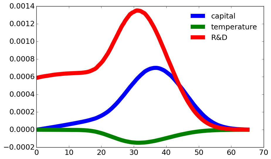 The marginal valuations of two endogenous state variables are of particular interest. In what follows, we report findings for the social cost of climate change and the social value of research and development. The former is measured as the negative of the marginal value of temperature, since warming induces a social cost.