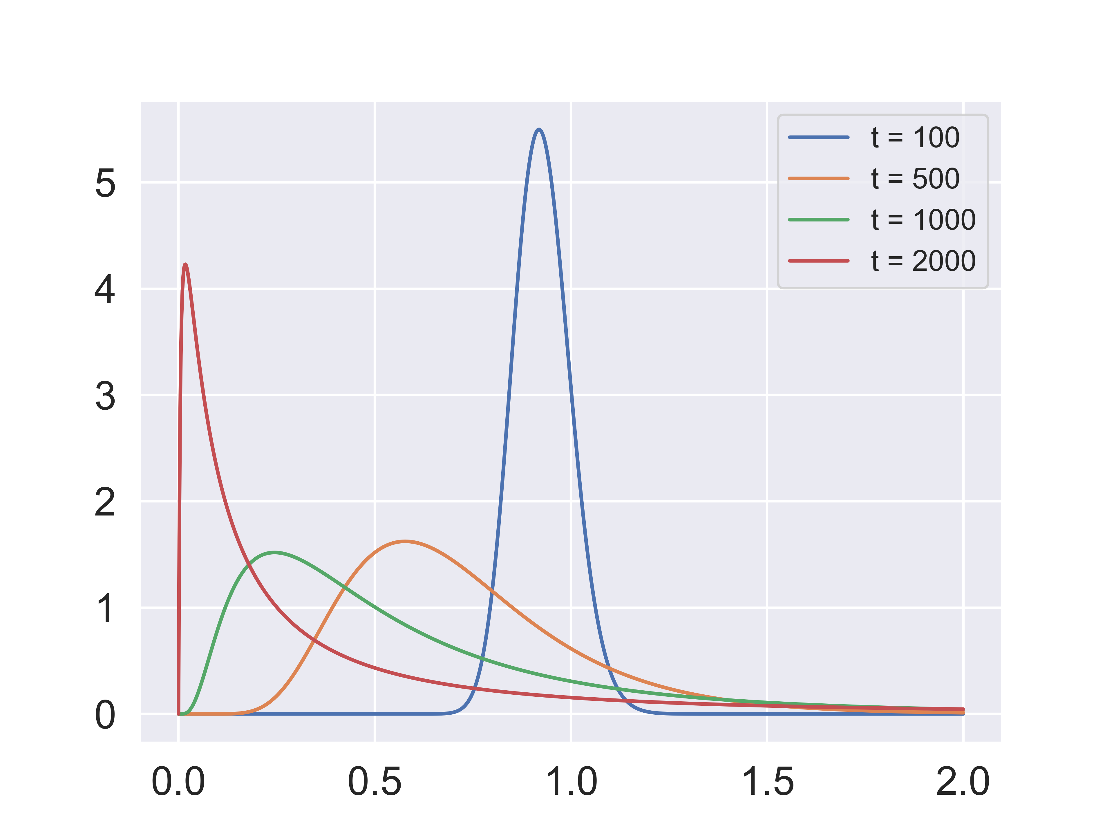 This figure is from [Borovička, 2020]. It plots the stationary densities for the fraction of aggregate consumption allocated to the first of two types of investors. The first is mistakenly optimistic about future consumption growth. The second knows the correct evolution. The figure illustrates that both consumers “survive” in the long run and that the allocation shifts in favor of the optimistic investor when both are more risk averse.